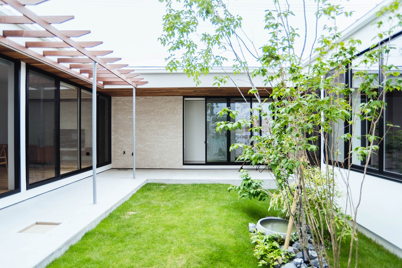 タイコウハウスでは「中庭を囲うコの字型の平屋」モデルハウスがありますが、外側の窓を極力減らし、「コ」の字に囲み、中庭に向かって開放感を高めた家を提案しています。